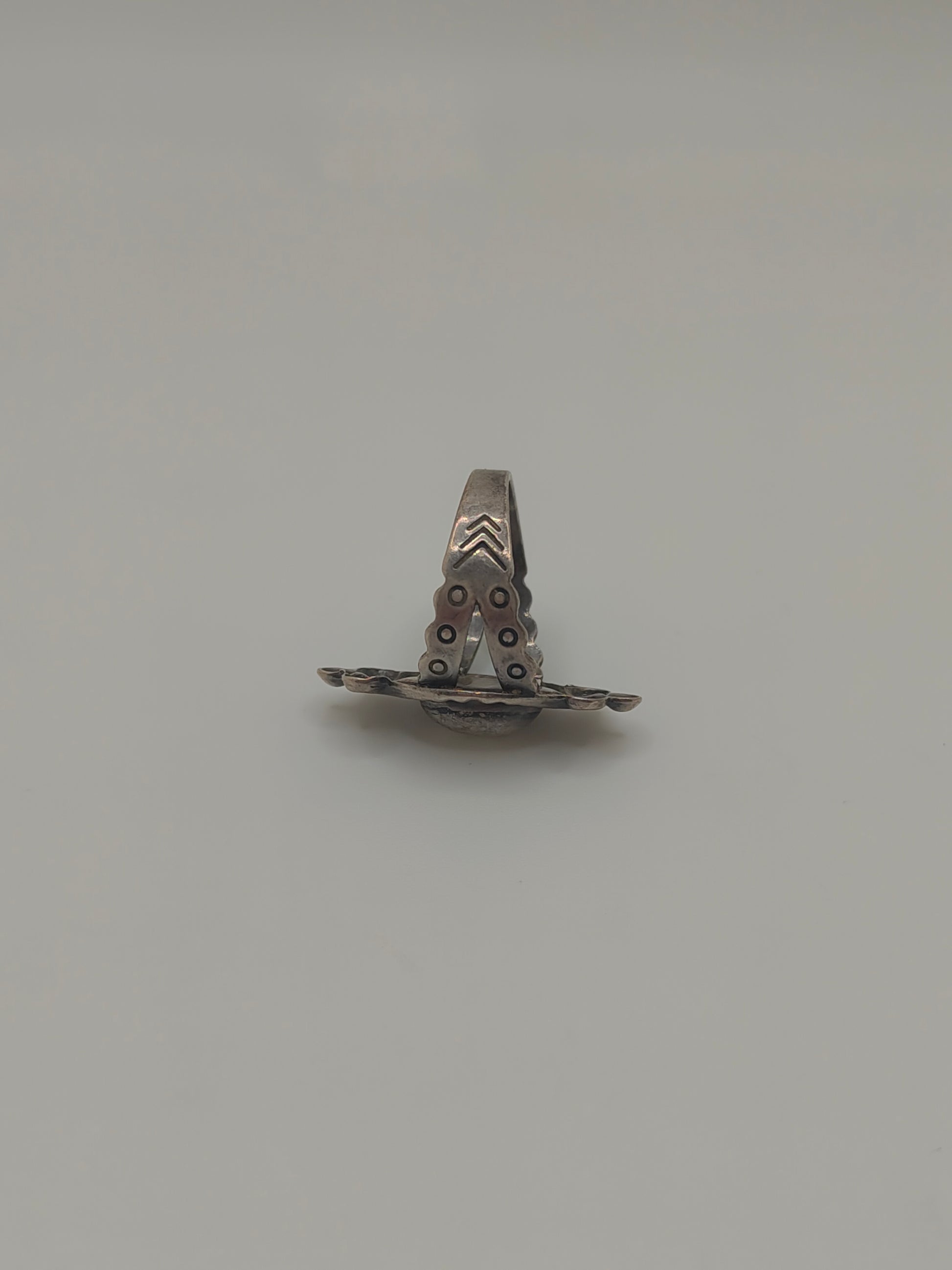 - Band: split shank with circular impressions + chevron detailing